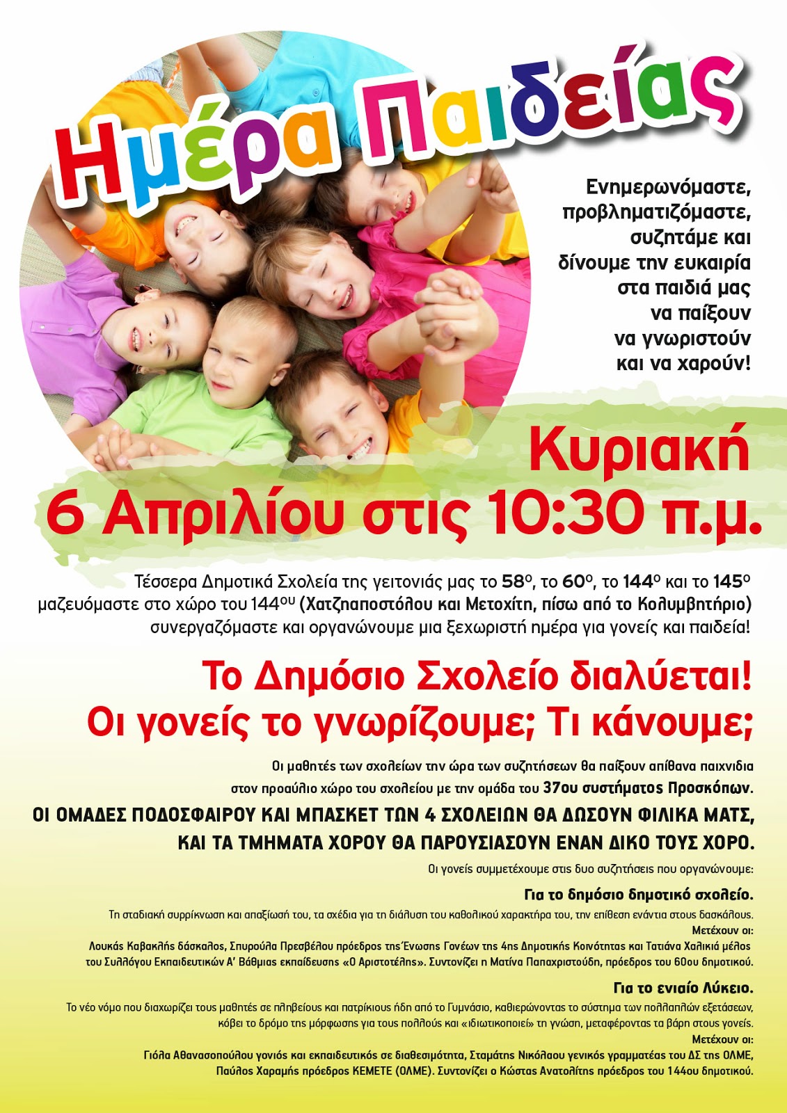 16. Συνδιοργάνωση με τα 60ο, 144ο και 145ο δημοτικά σχολεία Αθηνών Ημέρας Παιδείας με σκοπό την ενημέρωση και τον προβληματισμό μας σε σχέση με τα προβλήματα στο χώρο της παιδείας.